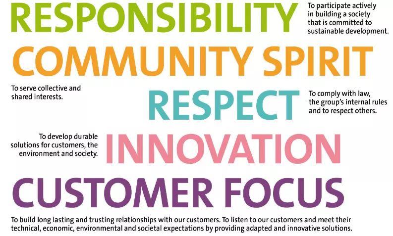 Les valeurs fondamentales de Veolia sont la responsabilité, la solidarité, le respect, l’innovation et le sens du client.